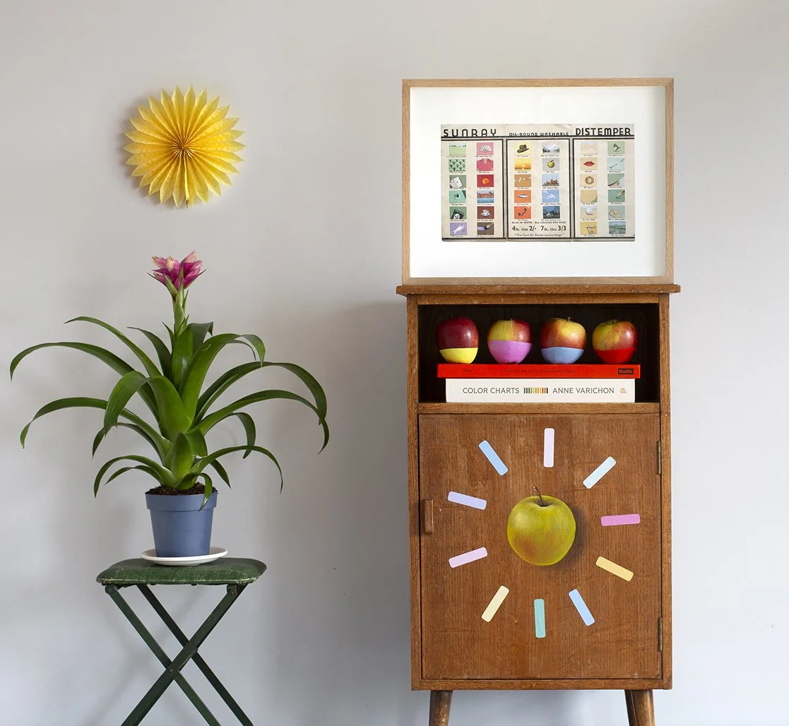 Sunray Oil-bound Washable Distemper, ‘The Cure For Dismal Surroundings’ is a paint chart from the 1930s and I couldn’t believe my eyes when I found it. It has the best advertising slogan I’ve ever seen on a paint chart and, despite being about 90 years old, the colours were still bright and fresh (with eleven greens!) and the surface was smooth and matt. It was irresistible! So I made it my first project of 2024. Here it is before and after its transformation: